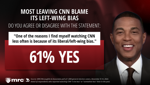 A new poll from the Media Research Center, conducted by McLaughlin & Associates, finds a majority (54%) of CNN viewers say they are now watching the network less than they used to, and most of those people (61%) agree that “one of the reasons I find myself watching CNN less often is because of its liberal/left-wing bias.”