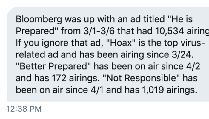 Advertising Analytics tweeted March 23 that “@prioritiesUSA is spending on broadcast targeting Trump over #CoronavirusPandemic.”