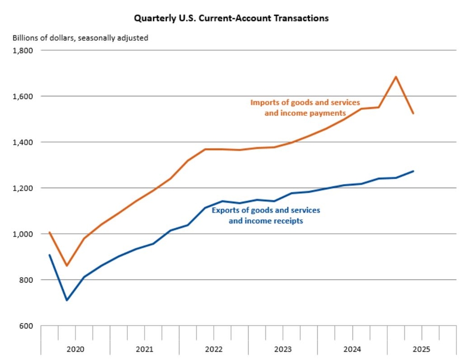 On the second day of the second quarter, President Donald Trump announced “reciprocal tariffs” on goods from countries charging exorbitant tariffs on U.S. exports. By the quarter’s end, the U.S. current account trade deficit shrank by 42.9%, the U.S. Bureau of Economic Analysis (BEA) reported Tuesday.