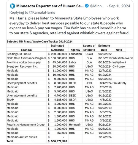 “[W]e did write to Kamala Harris and the DNC - multiple times - warning them about Tim Walz & his incompetence, fraud scandals and retaliation,” a post on the Minnesota Staff Fraud Reporting Commentary (formerly, Minnesota Department of Human Service Employees) X.com account explained Monday: