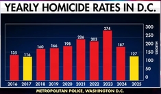 In 2025, D.C. police recorded 127 homicides, the lowest count in eight years, marking a significant decline from both 2024’s 187 total 2023’s two-decade high of 274.