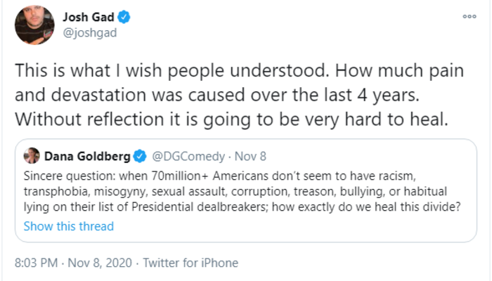 The actor then added that Trumpers should be the “FIRST to apologise” as “that’s the bare minimum before there can be any talk about love and moving forward.” Yes, point them to the specific bare spot on your rear that you’d like them to kiss, please.