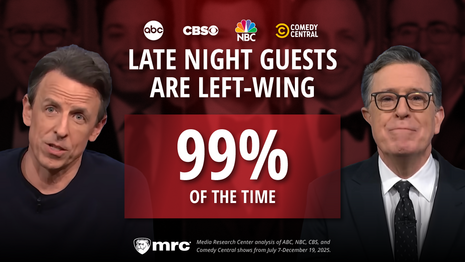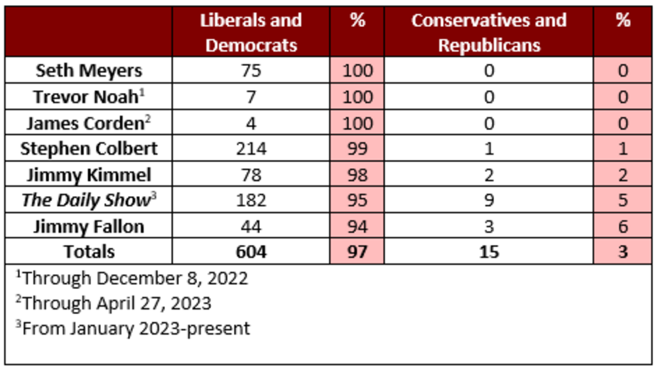 NewsBusters has been tracking late night comedy guest counts since September 2022, and the cumulative total now stands at 604 liberals and Democrats versus 15 conservatives and Republicans, or 97 percent.