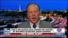 As the Media Research Center’s Curtis Houck reported on Monday, CNN’s Jim Acosta threw a hissy fit following yet another White House press briefing where he wasn’t called on to ask a question (the third by his count). And in a rather enthusiastic appearance on Fox News Channel’s Hannity, former White House Press Secretary Sean Spicer ripped into the moody CNN journalist for acting so immaturely.