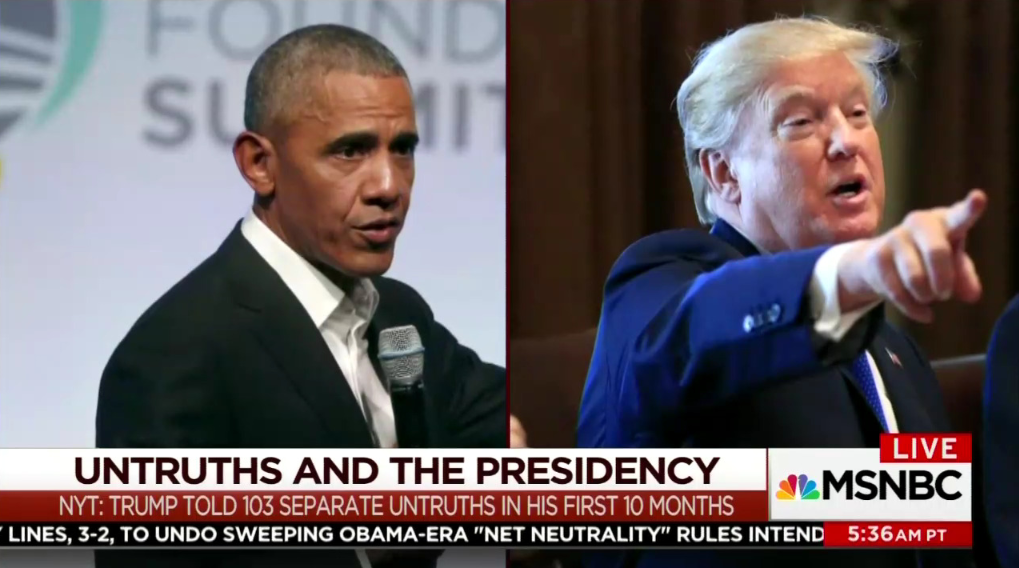 LEONHARDT: And when you do it, what you end up seeing is that Obama definitely said some untrue things. We know ‘em. You know, the fact that, that he said “if you like your health insurance plan, you can keep it,” that was false. Obama said false things about the high school dropout rate. But when you compare the same standard for Obama and Trump rather than doing different standards, you just end up seeing that the two of them are not close at all-