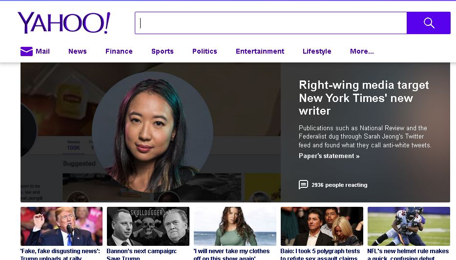 It’s clear from the headline that Yahoo! considers the whole thing a right-wing hit-job against Jeong: “Right-wing websites target New York Times' new writer over what they call 'anti-white' tweets.” Here’s the Yahoo headline as it appeared in the tab for the story: “Alt-right targets journalist over ‘anti-white’ tweets.” Notice that only one description gets the scare quotes, a clue that the headline writer thinks the phrase doesn’t really apply.