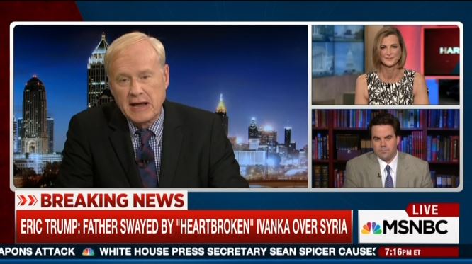 Referring to separate quotes from Eric Trump suggesting that sister Ivanka played a role in the Syrian airstrikes and that Trump officials are appeasers, Matthews added two minutes later that this “takes your breath away.”