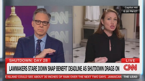 Tapper tried again by asking if she believes her state’s senators “should...vote to open the government so that these SNAP funds are not at risk,” but Stansbury falsely claimed the Trump White House “is choosing to starve American children.”