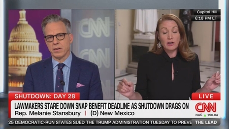 Grant him this, dear readers. On Tuesday, CNN’s The Lead host Jake Tapper was all of us in having to deal with the middle-aged, theatre kid buffoonery of Congresswoman Melanie Stansbury (D-NM), who was brought on as a Democrat from the Oversight Committee to counter an earlier interview with Chairman James Comer (R-KY) about the Biden autopen report. Instead, she hijacked it to accuse Republicans of wanting tens of millions to starve in the government shutdown.