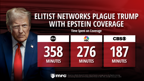 Since a July 7 Justice Department memo declared an “exhaustive review” of the Jeffrey Epstein case found he died by suicide and there was no evidence of a “client list,” ABC, CBS, and NBC have treated the so-called “Epstein Files” as the new Russiagate, submerging President Trump with a stunning 821 minutes of coverage on ABC, CBS, and NBC.