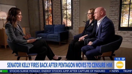 The ABC interview even included his wife, former Congresswoman Gabby Giffords (D-AZ). Co-host Michael Strahan teased an interview by chief business, economics, and technology correspondent Rebecca Jarvis in which Kelly would “fir[e] back...after the Defense Secretary Pete Hegseth’s censure, accusing the retired Navy captain of making seditious statements.”