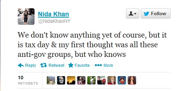 At 3:38 p.m. Eastern, Huffington Post blogger and Al Sharpton radio producer Nida Khan speculated on Twitter that an anti-government group may be responsible for the deadly bombings at the Boston Marathon.
