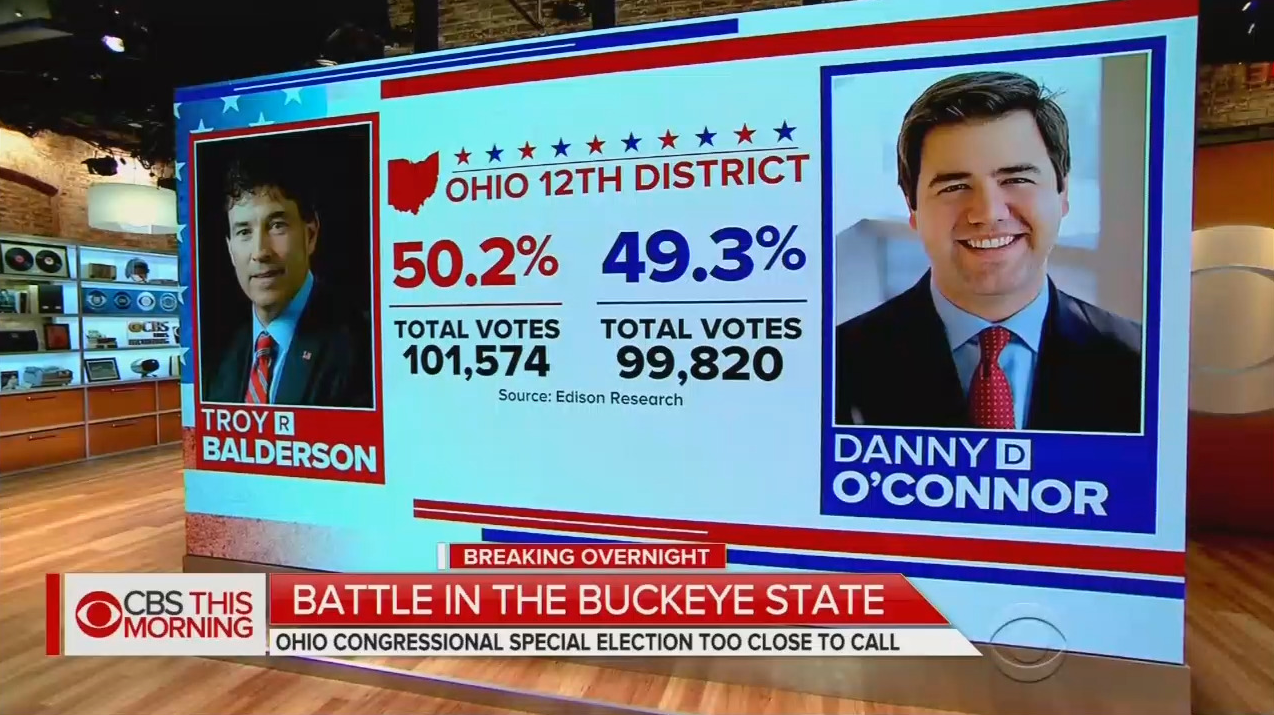 GAYLE KING: We begin with this, Republicans are claiming victory in a closely-watched congressional race in Ohio that is officially, as you’ve heard, too close to call. Republican Troy Balderson leads Democrat Danny O’Connor by more than 1,700 votes in a special election that the GOP has controlled for more than three decades.