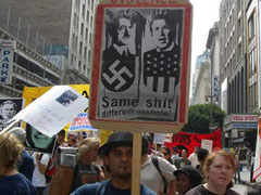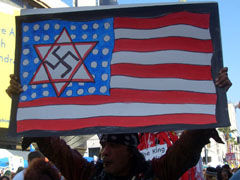 Over the past six years, I've attended numerous anti-war / anti-Bush demonstrations and have photographed thousands of crazy signs and banners; not only signs comparing President Bush (and Republicans in general) to Nazis, but also signs comparing the State of Israel to Nazi Germany, as well as countless signs and banners promoting the idea that President Bush and /or Israel were the "real" culprits behind the attacks of 9/11. These kinds of messages are so prevalent at leftwing protests that it would be impossible for any journalist to claim not to have seen them; they are literally everywhere one looks. And so I've always been amazed that the newspaper and television coverage of these protests never (and I really do mean never) showed, or mentioned, any of these outrageous images. I could only conclude, because the overtly offensive or blatantly anti-American signs that dominate these events cannot possibly be missed by any person with eyes, that the journalists sent to cover these demonstrations purposefully obfuscated the reality of what they saw. No doubt they did this because they sympathized with the anti-war or anti-Bush sentiment, yet were also savvy enough to understand that most Americans would find the behavior of the protestors appalling.