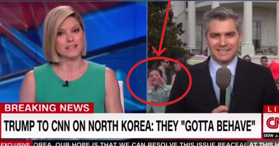 During a live CNN report in the 11 am ET hour, a young boy photobombed correspondent Jim Acosta and mouthed something at the camera, twice. There's no volume, so it's difficult to make out exactly what he's trying to say. Could it be "f----you"? Or maybe "fake news"?