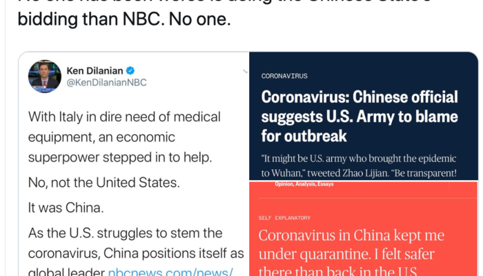 And in recent days, the Chinese propaganda machine was hard at work spreading conspiracy theories that claimed the virus started in the United States, instead of one of their dirty food markets. This was who CBS Praised.