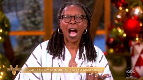 After playing edited soundbites of Trump rhetorically asking, “Why can't we have some people from Norway, Sweden,” moderator Whoopi Goldberg was noticeably irritated. “Well, they see you as the president, and they don't want to come here,” she sneered.