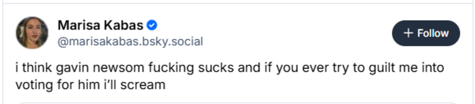 One such journalist was Marisa Kabas, whose leftwing credentials includes writing stories for MSNBC, the Huffington Post, The New Republic, and Rolling Stone. She left no doubt on where she now stands on Gavin Newsom as a result of his (for now) backtrack: