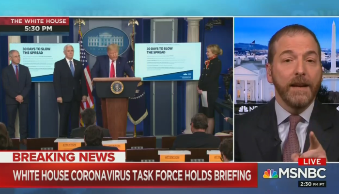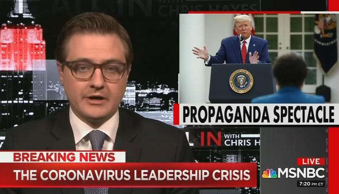 Now, ABC News hasn’t nationally carried a coronavirus briefing since Sunday. So despite his protestations, the network doesn’t seem to be listening to Karl's call to regularly carry them live. On Tuesday, MSNBC’s Chuck Todd offered an obnoxious disclaimer before Trump’s briefing. MSNBC's Chris Hayes called it “crazy” and “dangerous” to continue to air the briefings live.