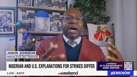 Marc Tamasco at Foxnews.com reported our least favorite journalism professor – Jason Johnson, the MS NOW contributor – appeared on The Weekend on Saturday to suggest Trump-ordered strikes on terrorist on Nigeria are racist. Of course he did.