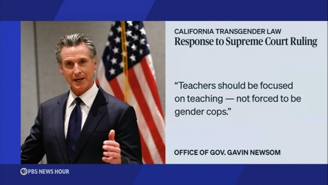 GEOFF BENNETT: California's governor is criticizing the U.S. Supreme Court's decision to temporarily block a state law banning public schools from outing transgender students to their parents. A spokesperson for Governor Gavin Newsom said 'teachers should be focused on teaching, not forced to be gender cops.'