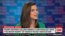 On Tuesday's The Situation Room, liberal CNN legal analyst Jeffrey Toobin and correspondent Kaitlan Collins got into a surprising debate over whether it was appropriate for President Donald Trump to call himself a "nationalist" as Collins claimed that the word "nationalism" had become "like Hitler" while Toobin seemed out of character as he defended the President.