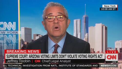 After the Supreme Court upheld an Arizona law on Thursday that threw out votes cast in the wrong precinct and prohibitions on ballot harvesting, the disgust and rage were palpable on CNN as disgraced chief legal analyst Jeffrey Toobin said this was the latest part of Chief Justice John Roberts' legacy of destroying "the most important civil rights law in American history."