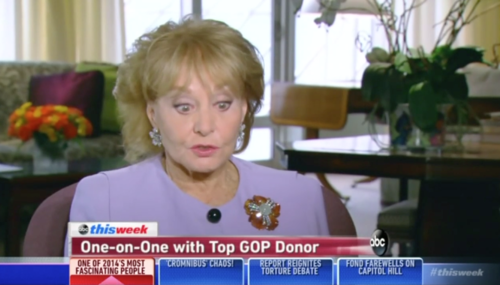 On Sunday, ABC’s This Week with George Stephanopoulos previewed Barbara Walters’ upcoming “Most Fascinating People” special set to air on Sunday night by playing a clip from Walters’ interview with conservative donor and businessman David Koch. Fill-in host Martha Raddatz introduced the clip of the interview by hyping “one of the more controversial parts of that legislation, provisions …