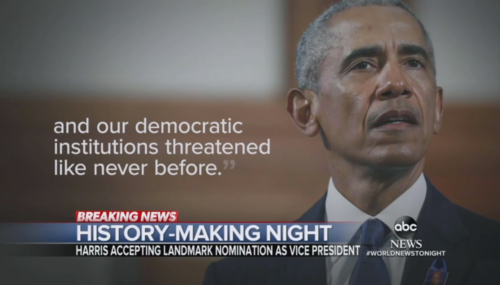 As much as the broadcast networks would have liked to, they couldn’t spend all week talking about Barack and Michelle Obama during their coverage of the virtual 2020 DNC. That said, they were able to muster fawning praise Wednesday night for vice presidential nominee Kamala Harris’s “soaring speech,” ensuring Americans “saw [Harris and Joe Biden] as human beings.”