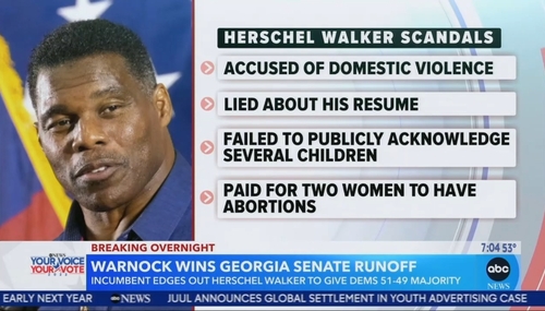 The flagship broadcast network news programs were ebullient Wednesday morning on the heels of their team’s victory in Tuesday’s Georgia Senate runoff election with Senator Raphael Warnock (D-GA) defeating Republican Herschel Walker, whom ABC, CBS, and NBC boasted had “struggled to overcome” “one scandal after another” (and thus allowed Warnock to evade questions about his past).