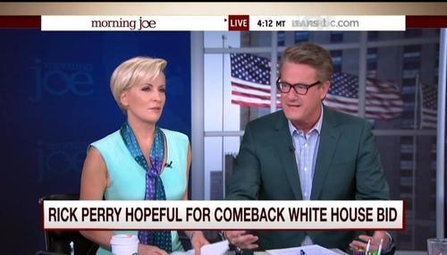 Reacting to Rick Perry’s announcement that he is running for president, MSNBC's Mika Brzezinski cheered the former Texas governor’s populist message. After playing a clip of Perry saying the “American people see a rigged game where the insiders get rich [and] the middle class pays the tab,” on Friday's Morning Joe Brzezinski couldn’t contain her excitement. She shouted: “It’s Elizabeth! It’s…