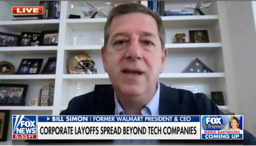 Appearing on Sunday's Fox & Friends Weekend, former Walmart CEO Bill Simon warned consumers that massive layoffs combined with the disastrous inflation crisis hurts “100 percent of the population.”
