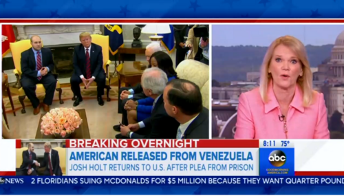 During Sunday’s Good Morning America, ABC News’ cast of characters exposed just how politically petty they were when they actually complained about President Trump getting positive coverage when he brings American hostages home. Between Tara Palmieri’s sympathies for Venezuela in her report and Martha Raddatz’s huffing about Trump getting a “boost,” their reporting was downright obnoxious.