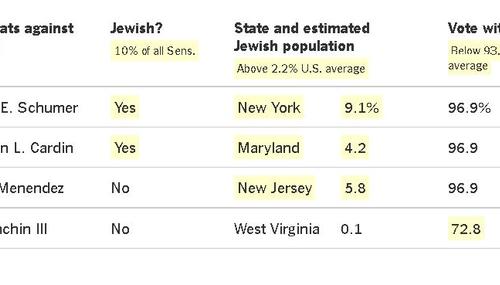Like a Monty Python skit gone tragic, the New York Times actually ran a chart labeling Democratic lawmakers against Obama's controversial nuclear deal with Iran as "Jewish?" or not (the "Jewish?" part was removed online after outcry). The four chart headings read: "Democrats against the deal – Jewish? – District and estimated Jewish population – Vote with party." Under "Democrats against the deal…