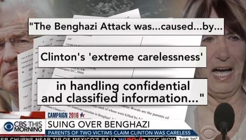 The three network morning shows on Tuesday allowed a scant minute and 59 seconds to a lawsuit filed against Hillary Clinton by the grieving parents of Benghazi victims. This is out of a total of eight hours of possible air time. ABC, CBS and NBC are continuing their pattern of showing very little interest in Pat Smith, the mother who condemned Clinton at the Republican National Convention.