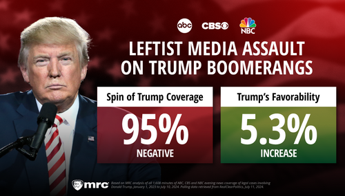 A new Media Research Center study found ABC, CBS and NBC devoted massive quantities of airtime (a whopping 1,608 minutes on just the three evening newscasts) to promoting the legal efforts against Trump, nearly all of it (95%) fiercely negative. Yet the liberal media’s crusade against the former president has utterly boomeranged.