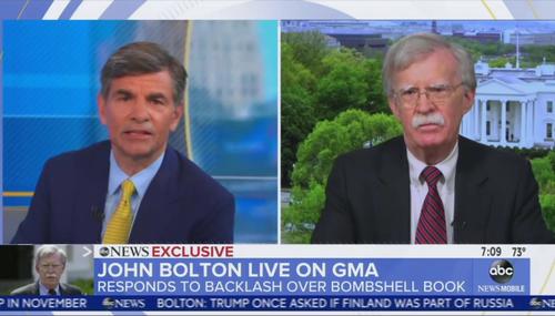 After hyping John Bolton’s anti-Trump book endlessly on ABC, the news network brought Bolton on Monday’s Good Morning America to grill him...from the left. Anchor George Stephanopoulos spent a good deal of the interview badgering the former National Security Advisor to switch parties and support Democrats’ never-ending impeachment efforts.