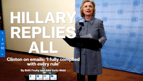 "Hillary Replies All" enthused the teaser headline at MSNBC.com this afternoon following former Secretary of State Hillary Clinton's press conference regarding the email server scandal. "Clinton on emails: 'I fully complied with every rule,'" noted the subheader for the story filed by the Lean Forward network's Beth Fouhy and Alex Seitz-Wald.
