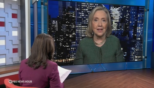 PBS News Hour anchor Amna Nawaz conducted an embarrassing gushfest with Hillary Clinton on Thursday night, nodding along as Hillary claimed "one choice literally could end our democracy. And I don't say that in any way of satisfaction, and I don't even think I'm exaggerating."