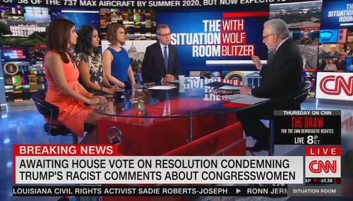 CNN’s Situation Room host Wolf Blitzer might be viewed as an iconic journalist and bastion of truth, but the Trump era has shown that he’s a liberal pundit who mirrors, say, MSNBC’s Rachel Maddow. On Tuesday’s show, Blitzer came back from break to insist that voting in support of a House Democrats resolution “condemning the President's racist comments...shouldn’t necessarily be a partisan…