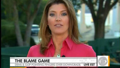 On Monday's Early Show, CBS's Norah O'Donnell promoted the left-of-center talking point that Standard & Poor's recent lowering of the U.S.'s credit rating is a "Tea Party downgrade." O'Donnell played three sound bites of notable liberals using this line of attack, versus only one opposing from a center-right politician. She also spun Treasury Geithner's decision to stay as "good news for…