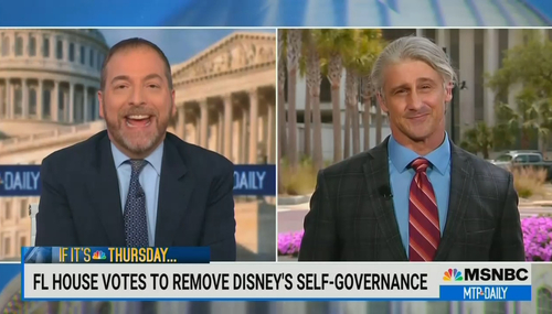 On MSNBC’s MTP Daily Thursday afternoon, host Chuck Todd and Florida-based NBC political reporter Marc Caputo wailed that Governor Ron DeSantis preparing to sign legislation revoking Disney World’s special economic status in the state had a “mafia feel.” The pair ranted that Florida was “only a good place to do business if you’re a private corporation that shares the ideology of the…