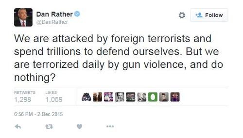 Since he’s been off of network TV for over a decade, disgraced former CBS News anchor Dan Rather took to Facebook and Twitter on Wednesday to call for the pass of gun control legislation to combat the claim that the U.S. is being “terrorized daily by gun violence” akin to how the U.S. “spend[s] trillions to defend ourselves” from “foreign terrorists.”