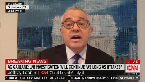 During CNN's breaking news coverage of Attorney General Merrick Garland's news conference on the Justice Department's January 6 investigation, chief legal analyst Jeffrey Toobin scoffed at Garland's desire to prosecute political violence no matter what political party is involved.