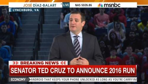 MSNBC journalists on Monday reacted predictably to Ted Cruz's announcement that he is running for President. Former Newsweek senior editor Jonathan Alter summed up the Republican's vision by comparing Cruz to Barry Goldwater's 1964 campaign. Connecting the two, Alter concluded, "So, that's the Ted Cruz message, 'extremism is good.'"