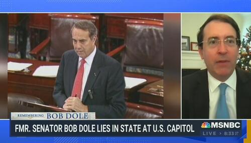 During its coverage following the Capitol Hill ceremony honoring the late Bob Dole, MSNBC painted the former war hero, senator, and presidential candidate as "a complicated figure" because he was a Republican who voted for Donald Trump. At one point, a guest even slammed Dole as "a big insult politician."