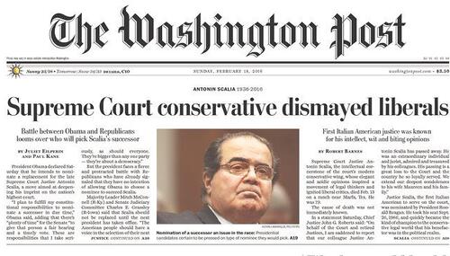 What was the most important thing for readers of Washington Post to see on the front-page of the paper Sunday morning? A headline focusing directly on the death of Antonin Scalia? No. In bold, large font, the Post declared, “Supreme Court Conservative Dismayed Liberals.”