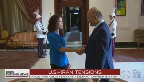 On Monday, CBS correspondent Roxana Saberi used Iraqi President Barham Salih to shame the United States for the military response to threats posed by Iran against U.S. forces and interests in the region. Then, on Thursday’s CBS Evening News, she appeared to up the ante by passing along a threat of violence against the U.S. made by an Iraqi politician who was part of an Iranian-backed “militia…