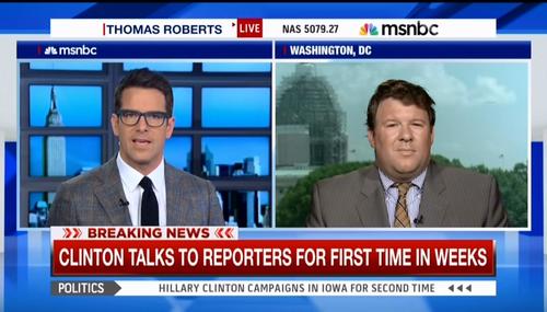 Following Hillary Clinton’s first time engaging with the press in nearly a month, MSNBC predictably cheered her performance. Evidently 28 days is not enough of an opportunity to prepare for questions, because afternoon host Thomas Roberts lauded her brief few minutes with the press: “She was pretty great on the fly answering these questions. She didn't hedge on much of anything. And she buckled…