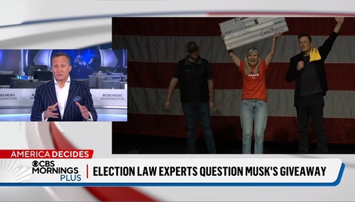 With CBS Mornings Plus leading the way, the major broadcast networks spent Monday morning giddily declaring Telsa founder and X owner Elon Musk could end up indicted by Biden-Harris Justice Department for his America PAC’s daily, $1 million giveaway to registered voters in swing states “raising new legal questions” and “blow[ing] past the line” of legality.